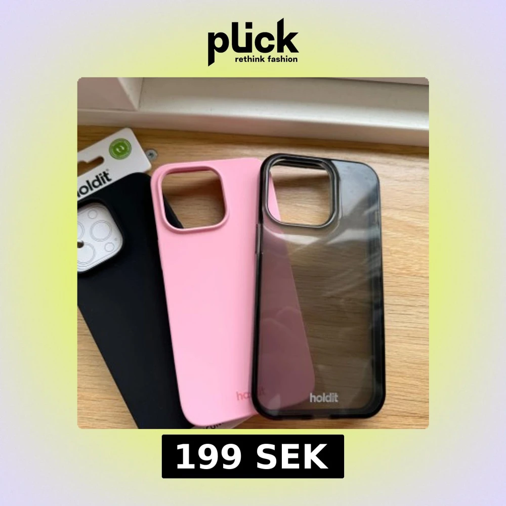 Säljer tre snygga mobilskal från Holdit i olika färger: ett svart, ett ljusrosa och ett transparent med svart kant. Skalen har stilren design och passar perfekt för att ge mobilen en personlig touch. Till iPhone 13pro