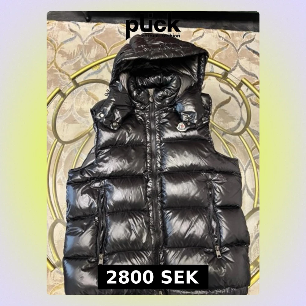 Säljer en svart, glansig dunväst från Moncler med avtagbar huva och två dragkedjeförsedda fickor. Västen har quiltad design och klassisk Moncler-logga på bröstet. Perfekt för kalla dagar när du vill ha både stil och värme.