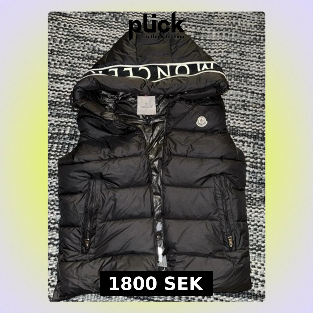 Svart dunväst från Moncler med stor huva och tydlig logotyp på huvkanten. Västen har två fickor med dragkedja, quiltad design och klassisk Moncler-märke på bröstet. Materialet är glansigt och känns riktigt lyxigt, perfekt för kyliga dagar.