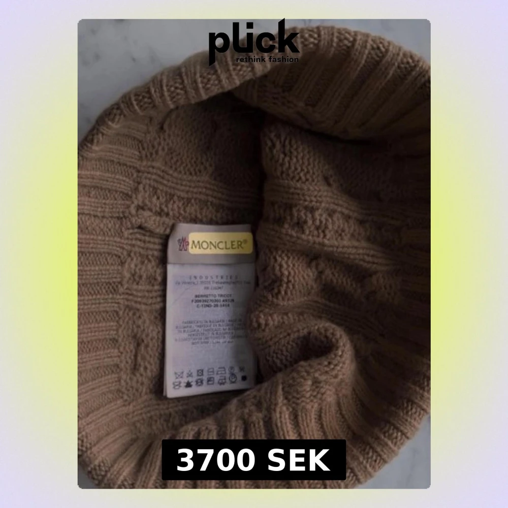 Säljer en beige stickad mössa från Moncler med flätmönster och stor pälsboll på toppen. Mössan har en bred ribbad kant och Moncler-logga framtill. Materialet är en lyxig blandning av kashmir och ull, vilket gör den supermjuk och varm.