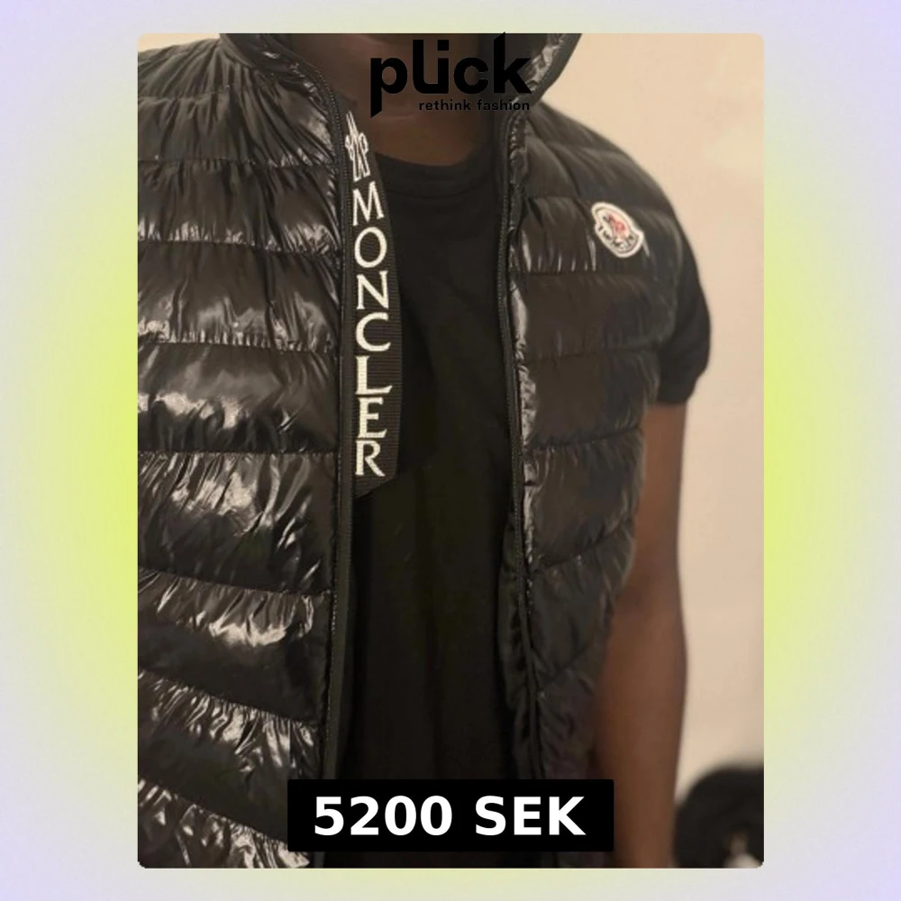 Säljer en svart, glansig dunväst från Moncler med broderad logga på bröstet och tydlig Moncler-text på insidan av dragkedjan. Västen har quiltad design och är tillverkad i polyester med dunfyllning. Perfekt för lager-på-lager under kyliga dagar. Är lite sönder på innerfickan men kan troligtvis fixas om man syr. I storlek s men passar M/L