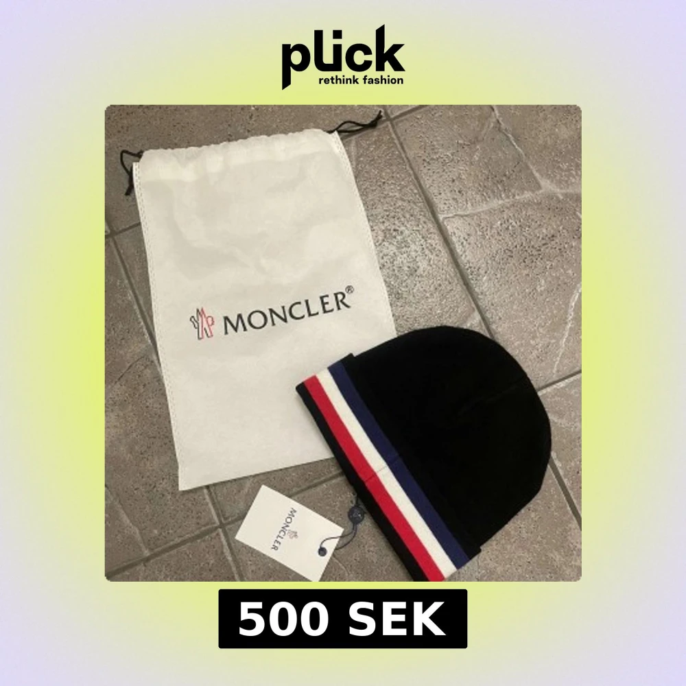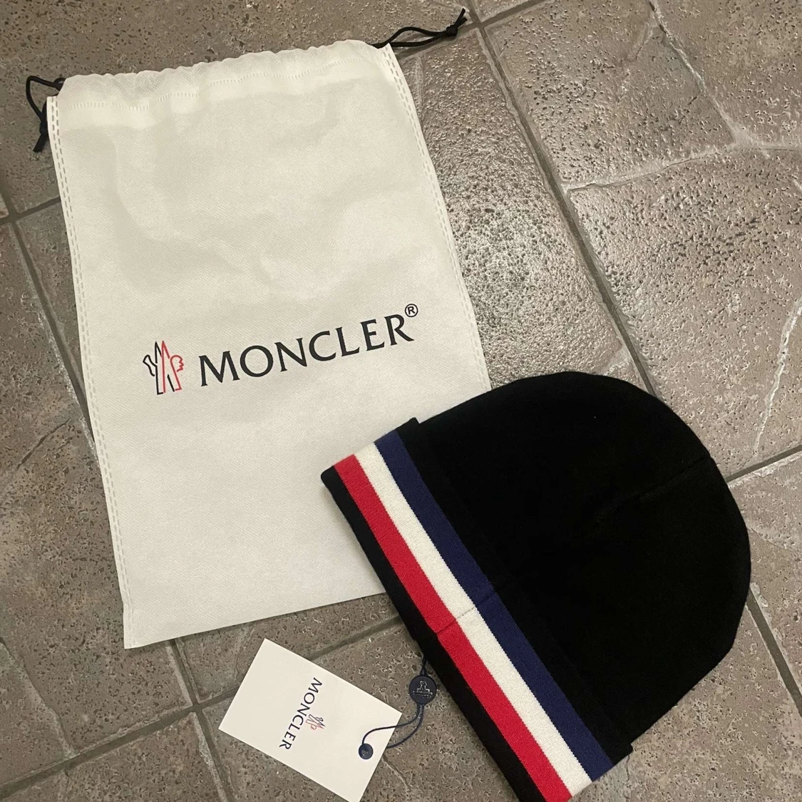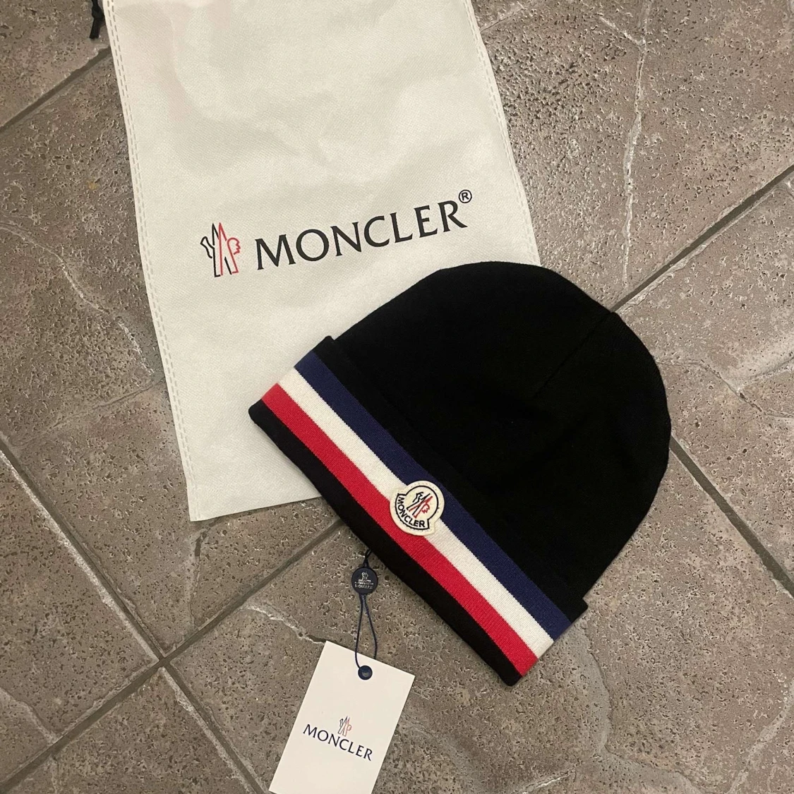 Svart Moncler mössa i mjuk ull med klassiska Moncler-loggan framtill. Mössan har breda ränder i rött, vitt och blått längs kanten för en sportig och stilren look. Perfekt accessoar för att hålla värmen och lyfta din outfit.