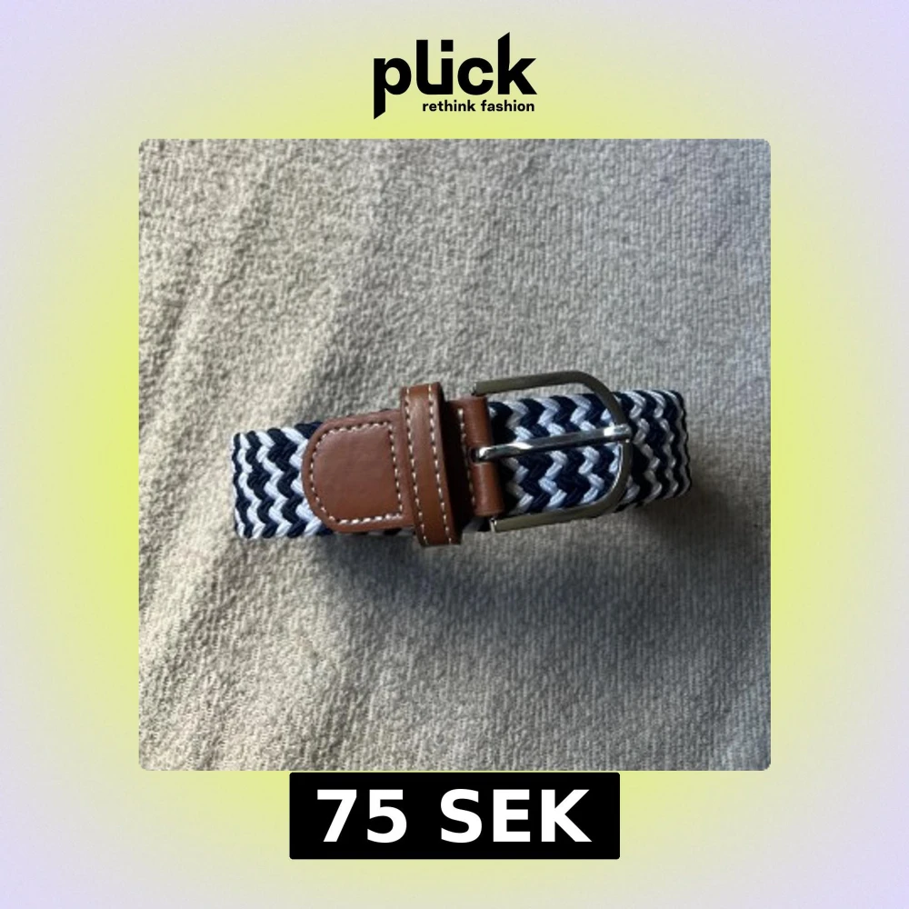Snyggt flätat bälte i blått och vitt med bruna läderdetaljer och silverfärgat spänne. Perfekt för att ge en stilren touch till din outfit.