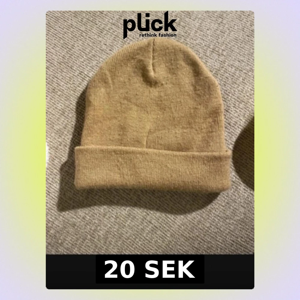 Bilden visar en beige stickad mössa, passar både barn o vuxen
