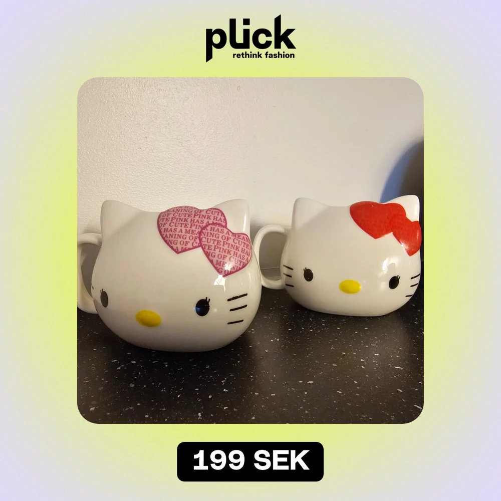 Två supergulliga Hello Kitty-muggar i keramik, designade för 35-årsjubileet. En mugg har en röd rosett och den andra en rosa med text. Perfekta för samlare eller som en söt present! 🐱🎀