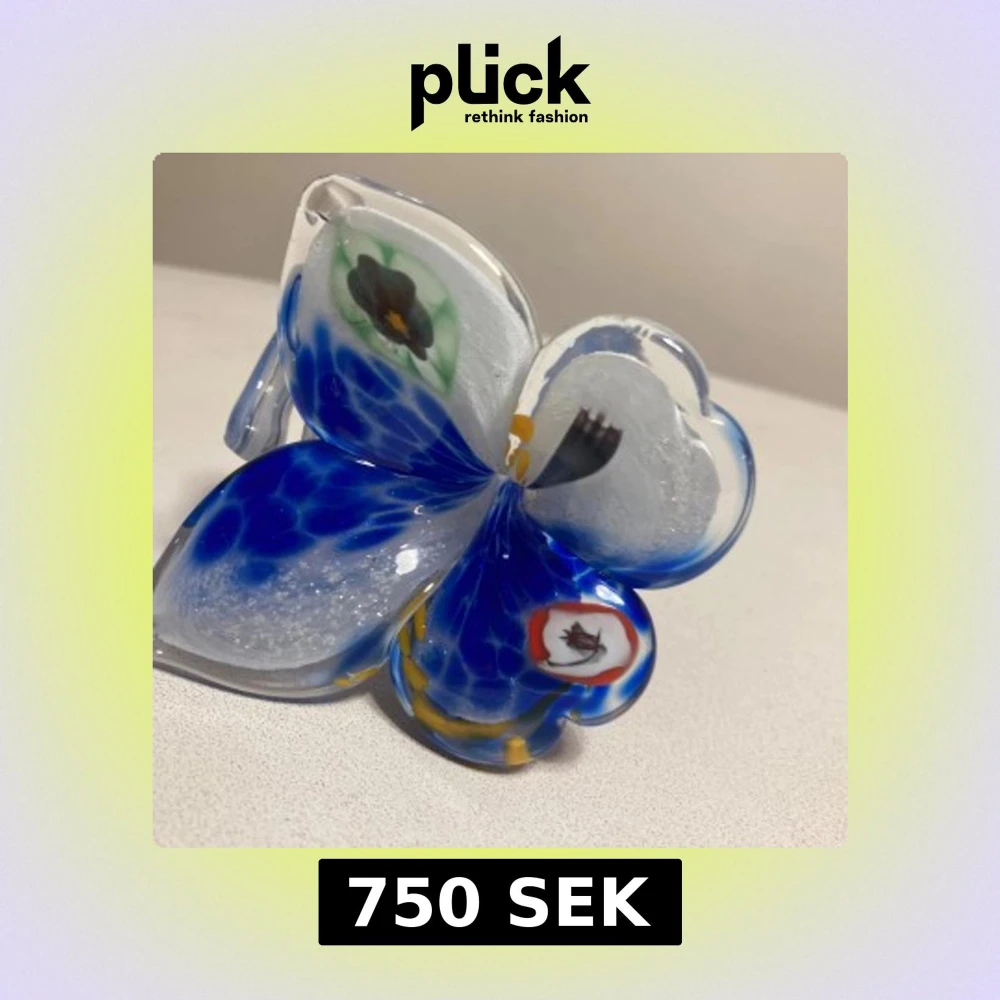 Detta är en handgjord glasprydnad i form av en fjäril med vackra blå, vita och gula färger samt blommotiv. Unik och dekorativ, perfekt för samlare eller som färgglad inredningsdetalj. Inga synliga defekter eller skador på glaset.