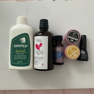Ren aceton, akrylvätska , 2 olika gelé färger som är guld och svart + en basecote. Säljs spretat också , priset kan diskuteras