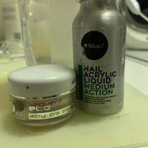 Vätska och akryl pulver för att göra naglar. Halva kvar av dem båda