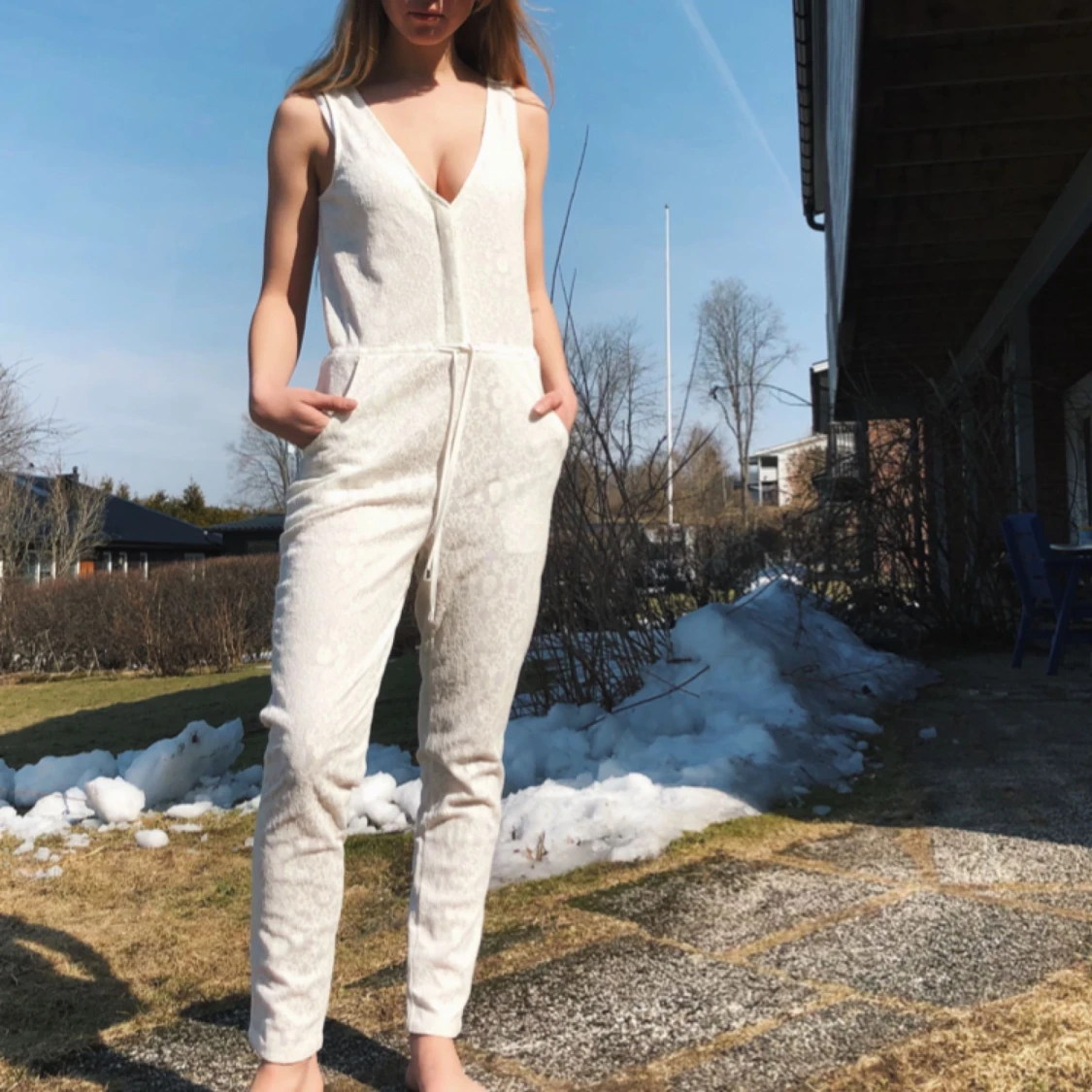 Vit byxdress helt i spets, fin att ha både åtdragen i midjan eller lös. Använd 1 gång. Jag är 170 och den passar mig perfekt.