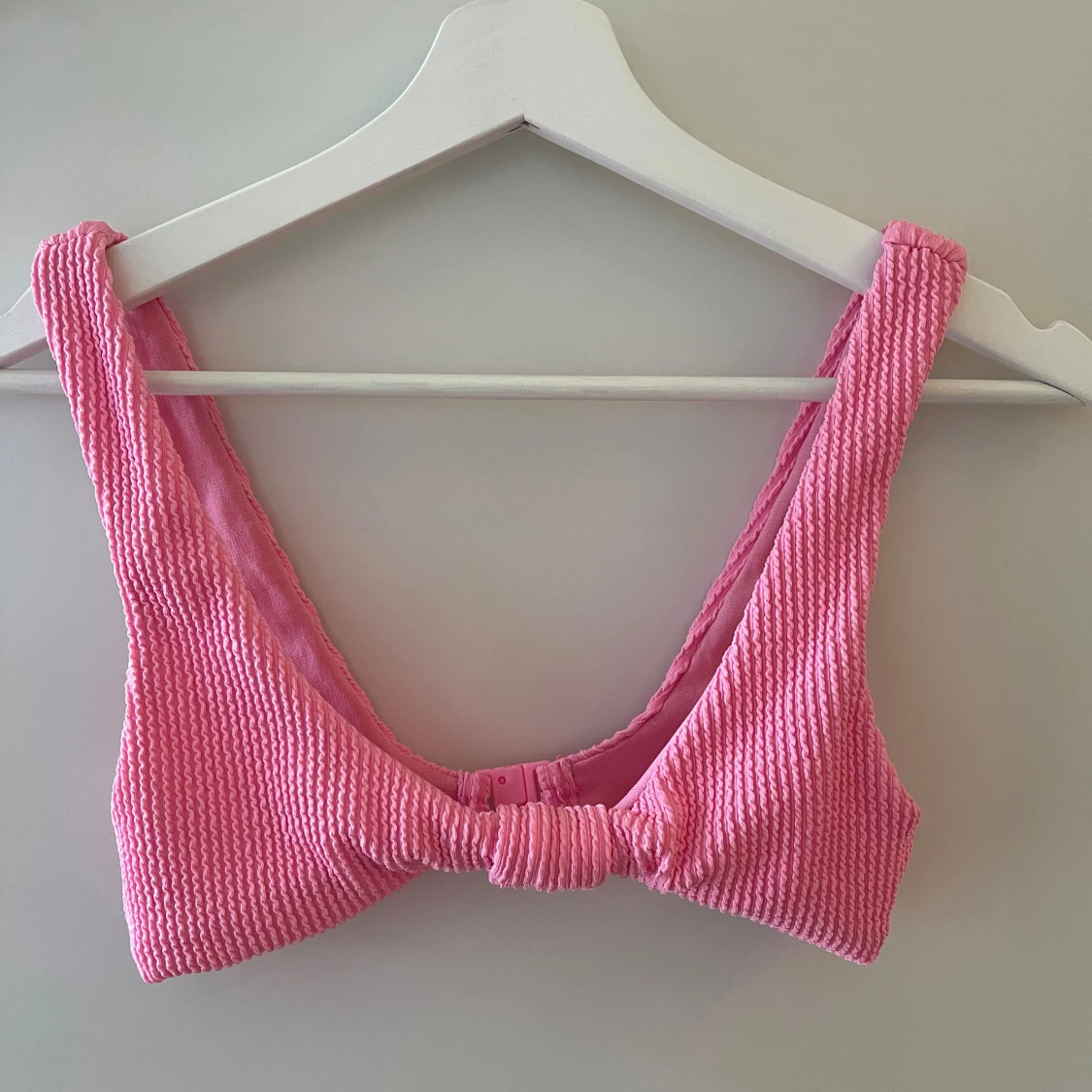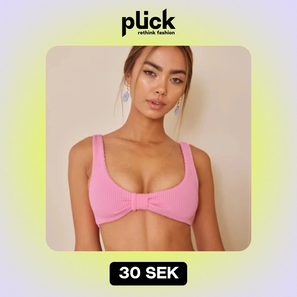 Säljer en superfin rosa bikiniöverdel med ribbad textur. Den har en söt knytdetalj framtill som ger en extra touch. Perfekt för sommarens alla badäventyr!