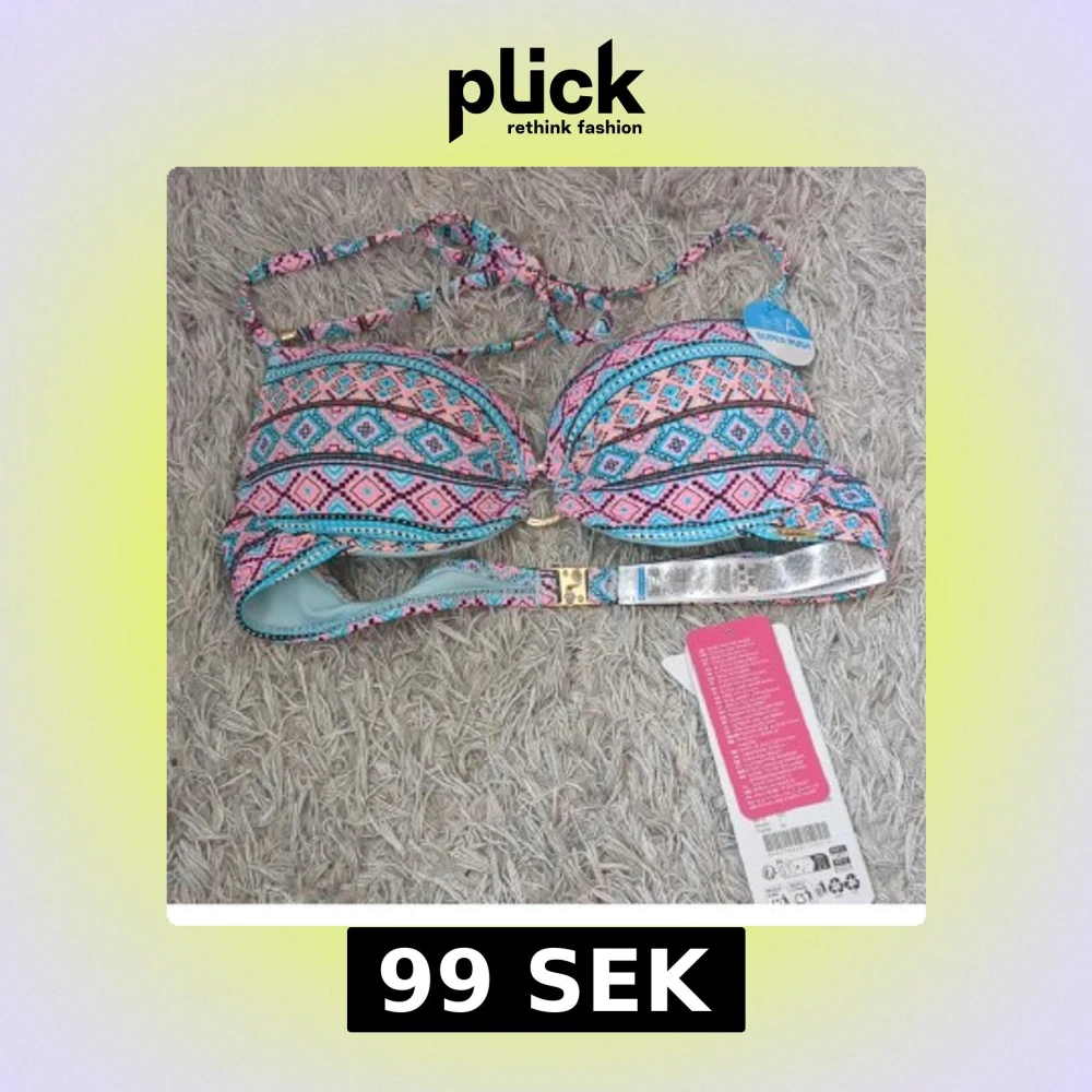 Säljer en super push-up bikiniöverdel med snyggt geometriskt mönster i rosa, blått och svart. Den har guldfärgade detaljer, knyt i nacken och ett coolt spänne i ryggen. Perfekt för dig som vill ha extra stöd och en färgstark look på stranden!