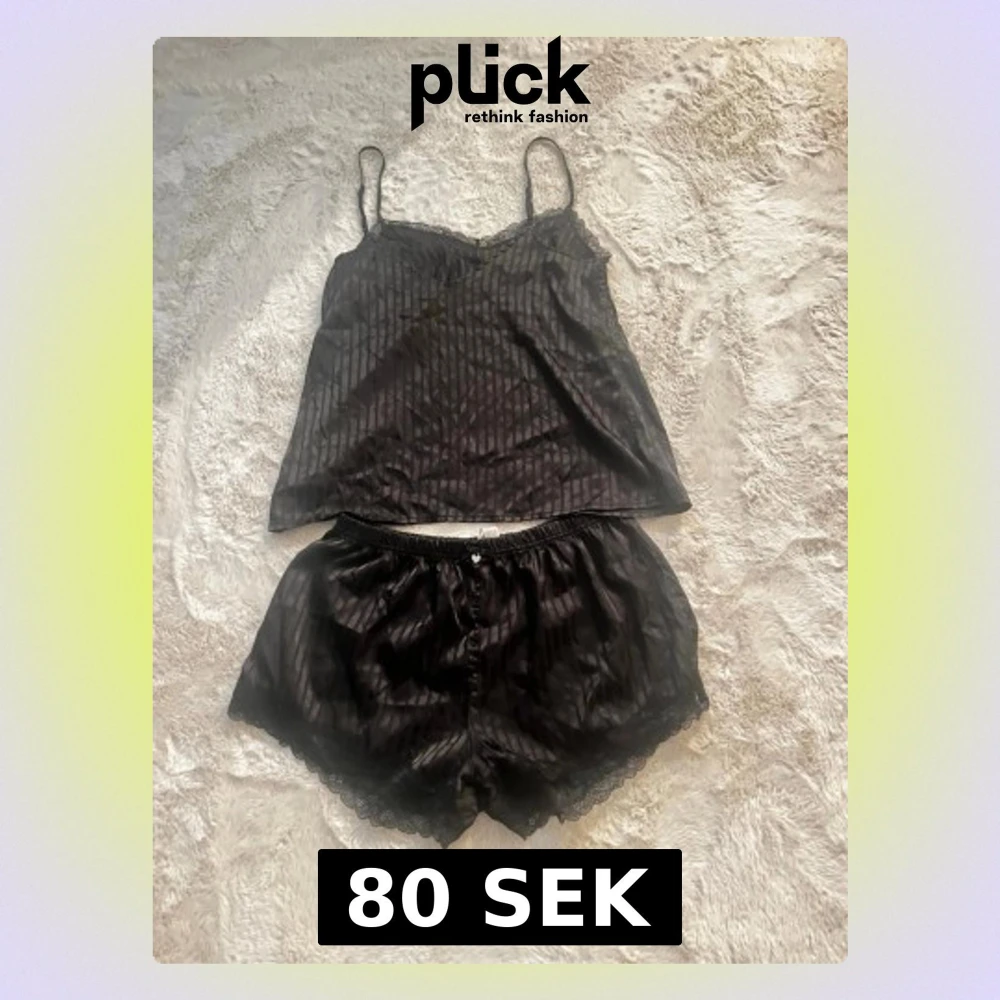 Säljer en svart pyjamas i satin från New Yorker med tunna axelband och randigt mönster. Överdelen har spetsdetaljer vid urringningen och en mjuk, glansig finish som ger en lyxig känsla.