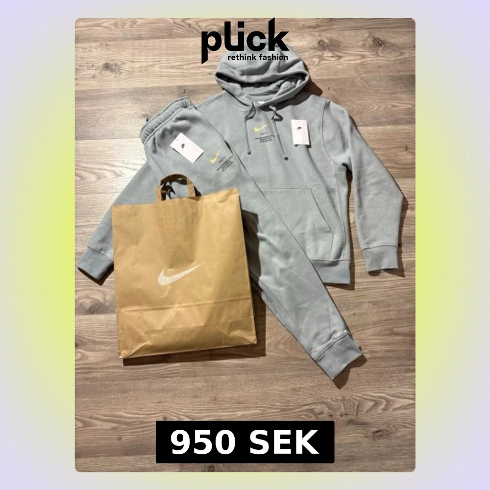 Snyggt mintgrönt loungewear set från Nike med matchande hoodie och byxor. Hoodien har dragsko, magficka och tryckt Nike-logga i gult och svart på bröstet. Byxorna har resår i midjan och vid benslut samt samma logga på benet. Perfekt för chill dagar hemma.