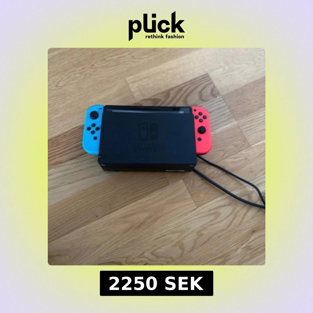 Bilderna visar en Nintendo Switch-spelkonsol med blå och röd Joy-Con, dockningsstation, laddare och tillbehör. Perfekt för gaming på språng eller hemma, ensam eller med vänner. En populär konsol bland unga och unga vuxna som gillar flexibelt och socialt spelande. Det är en liten plats bit som är borta på ena spelkontrollen men den funkar utmärkt ändå!