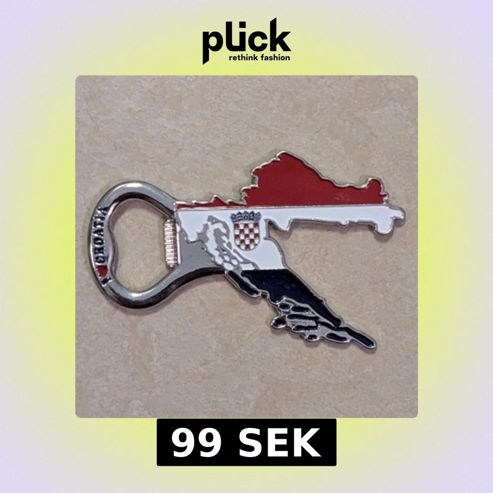 HELT OANVÄND flasköppnare / souvenir. Metallisk flasköppnare i form av Kroatiens karta, dekorerad med landets flagga och vapensköld. Utrustad med magnet på baksidan för enkel förvaring på kylskåp. Inga synliga defekter eller slitage, i mycket gott skick.