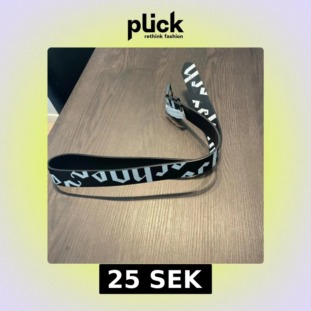 Snyggt svart bälte från bershka med vit grafisk text längs hela bandet. Bältet har en stilren, svart spänne och är gjort i syntetmaterial. Perfekt accessoar för att lyfta din outfit med en modern touch.