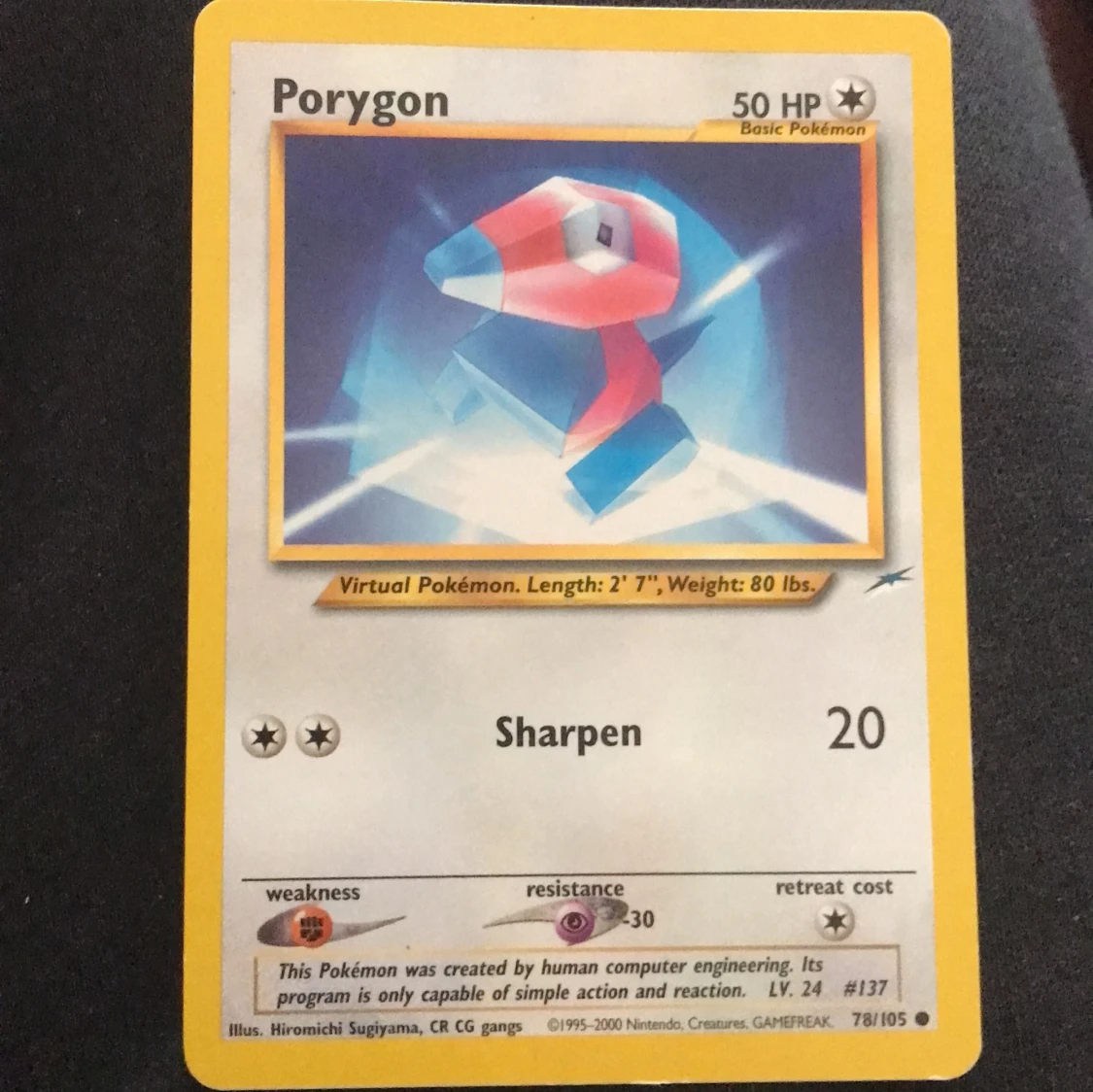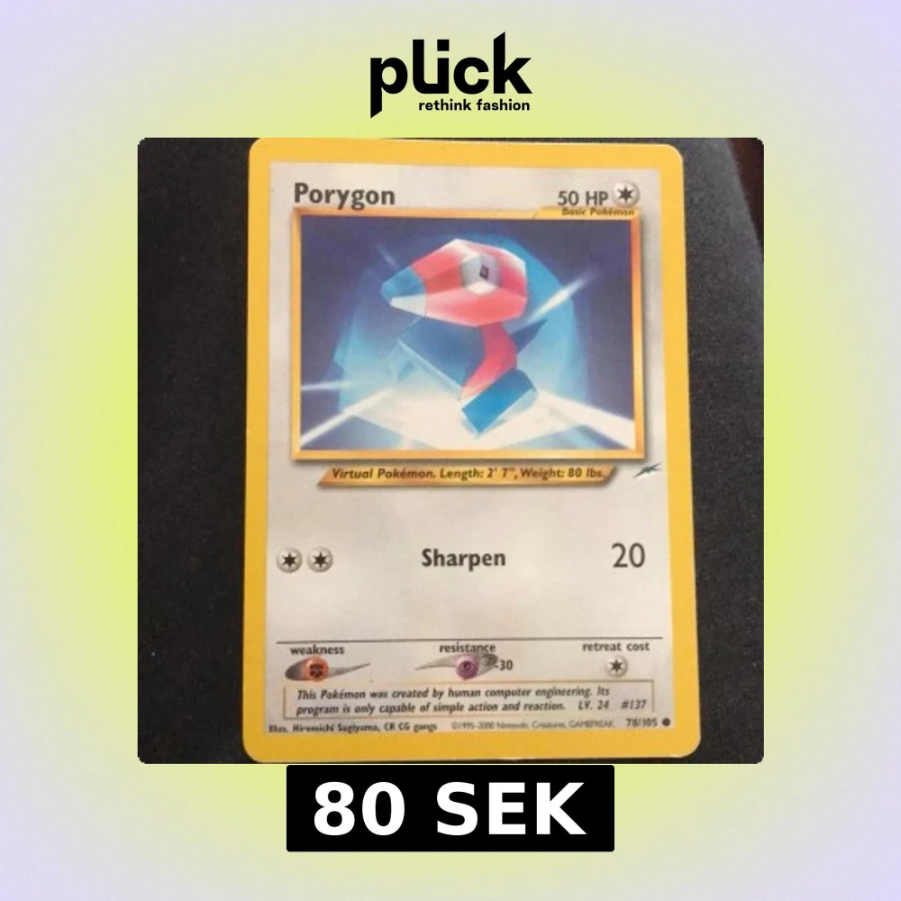 Klassiskt Pokémonkort med Porygon! Perfekt för samlare och fans av retro Pokémon. Kortet har coolt 3D-inspirerat motiv och är från 2000. Ett måste för dig som vill utöka din samling med nostalgi och stil.