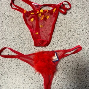 Söt och sexig tvådelad underklädesuppsättning i röd färg. Den övre delen är en trosa med fint broderi och den nedre delen är en trosa med röd fjäderdetalj. Perfekt för en romantisk kväll eller som en speciell present. Ej använda. Nya.