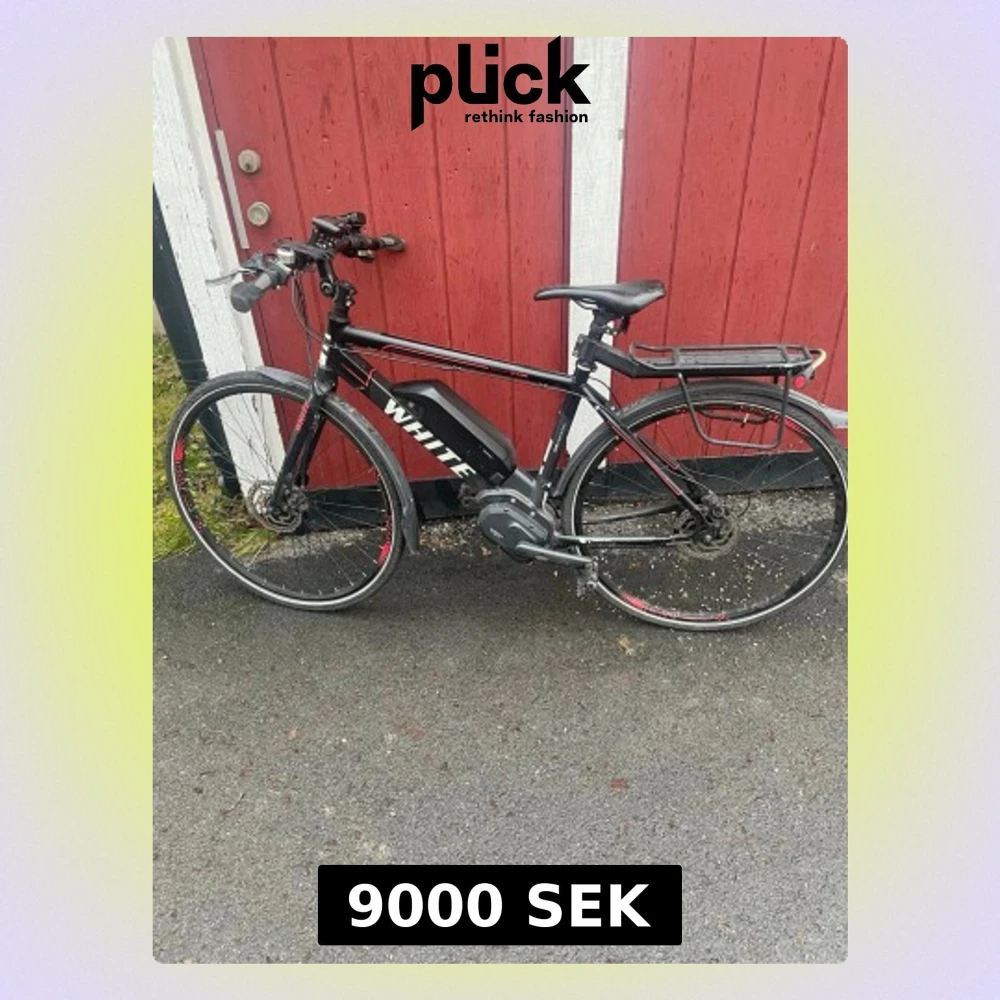Bilderna visar en svart elcykel av märket White. 25km/h. Två batterier medföljer + laddare.