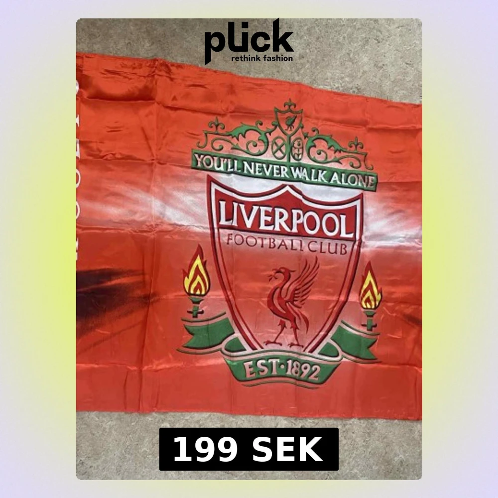 Stor röd flagga med Liverpool Football Club-logga och texten 'You'll Never Walk Alone' i grönt. Flaggan har detaljer i gult och grönt samt motiv av facklor och fågel. Perfekt för fotbollsfans som vill visa sitt stöd för laget.