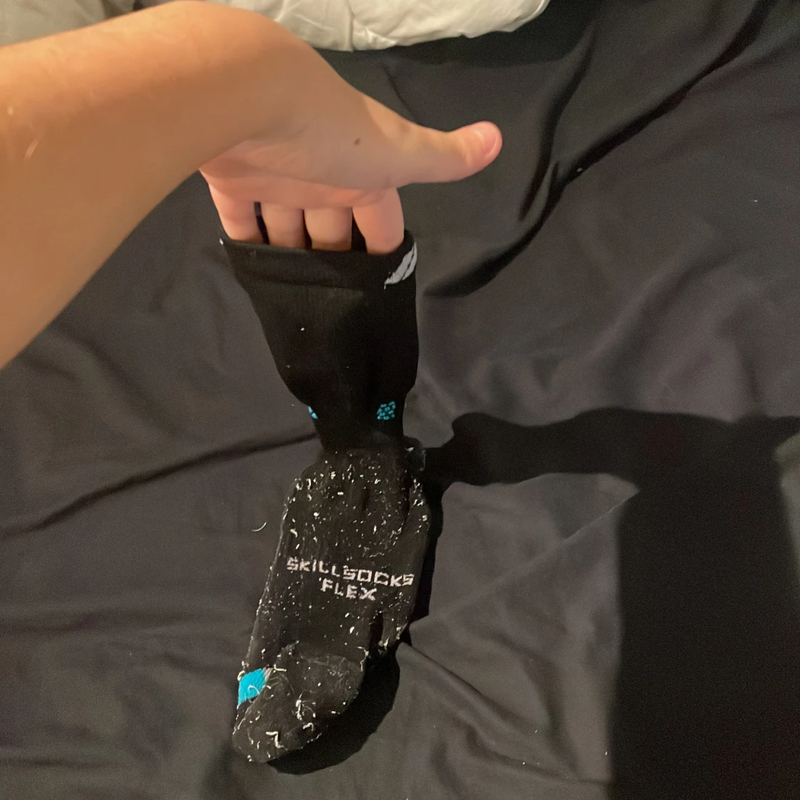 Svarta träningsstrumpor från Skillsocks Flex med vita och turkosa detaljer. Undersidan har vita prickar för extra grepp och texten 'SKILLSOCKS FLEX' på ovansidan. Perfekta för sport och aktivitet, med en normal passform och syntetmaterial.