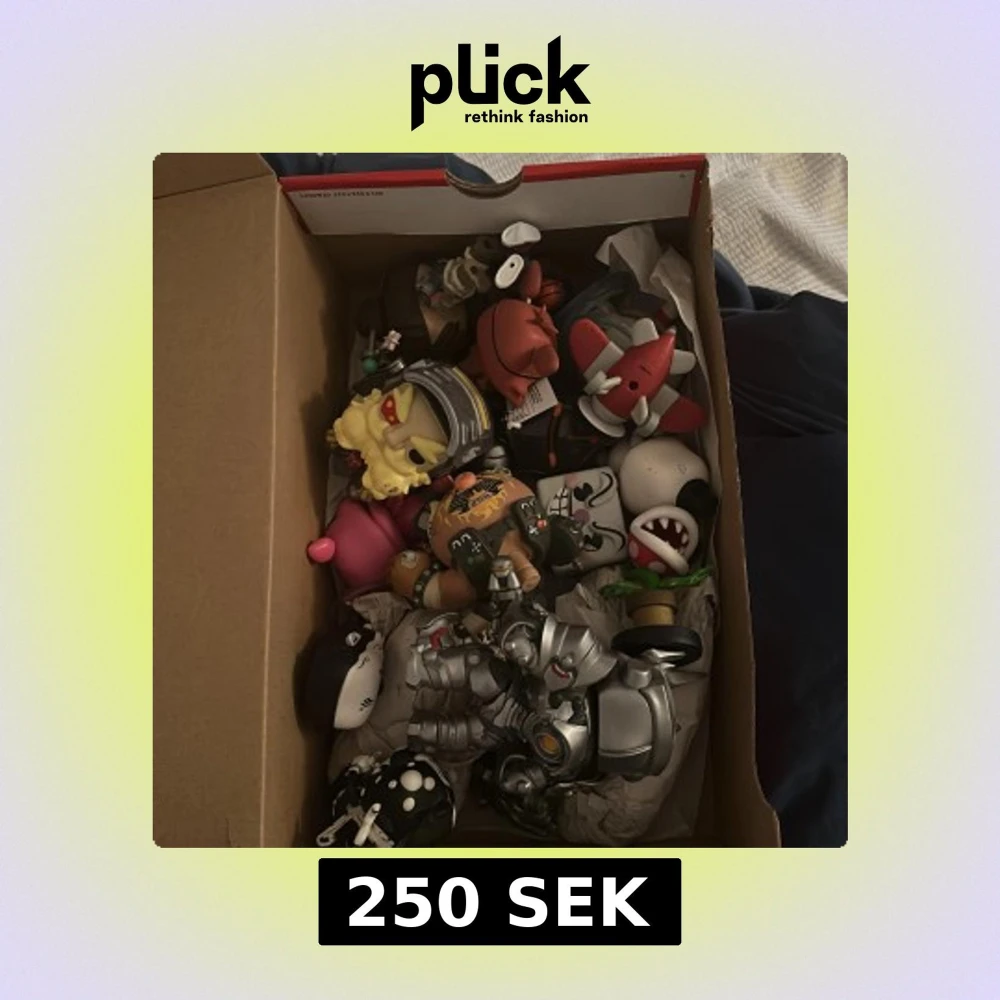 Bilderna visar en låda fylld med olika samlarfigurer och leksaker från populärkultur och spelvärlden. Figurerna är färgglada och har unika designer, perfekta för dig som gillar gaming, anime eller coola collectibles. Ingen bok syns på bilderna.