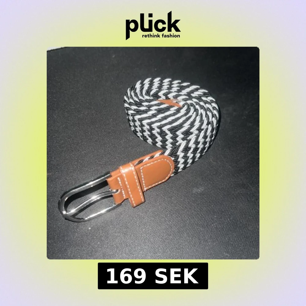 Säljer ett snyggt svartvitt flätat bälte med bruna skinn-detaljer vid spännet och änden. Bältet har ett klassiskt metallspänne och ett randigt mönster. Perfekt accessoar för att lyfta din outfit.