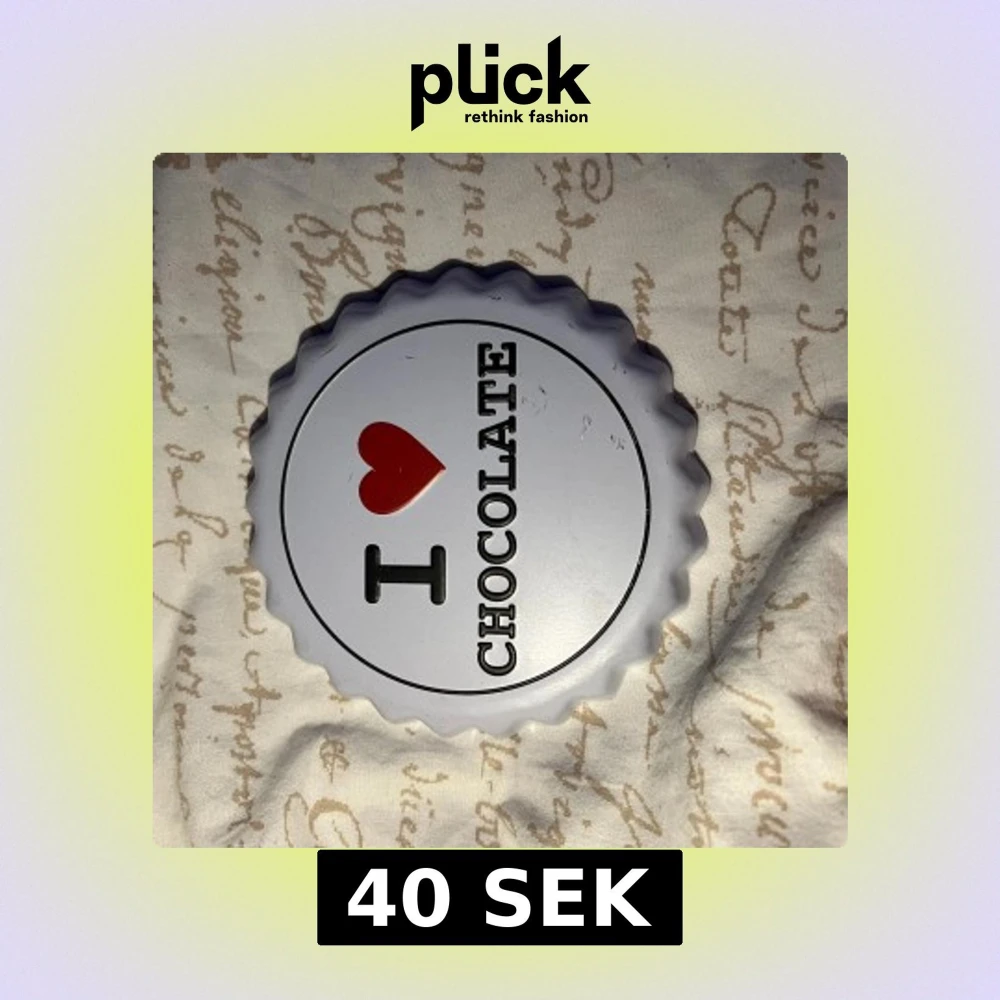Dekorativ väggprydnad i form av kapsyl med texten 'I ♥ CHOCOLATE'. Tillverkad i metall, med upphängningsfäste. Några små repor och märken syns på ytan, men i gott skick. Perfekt för kök eller café med chokladtema.