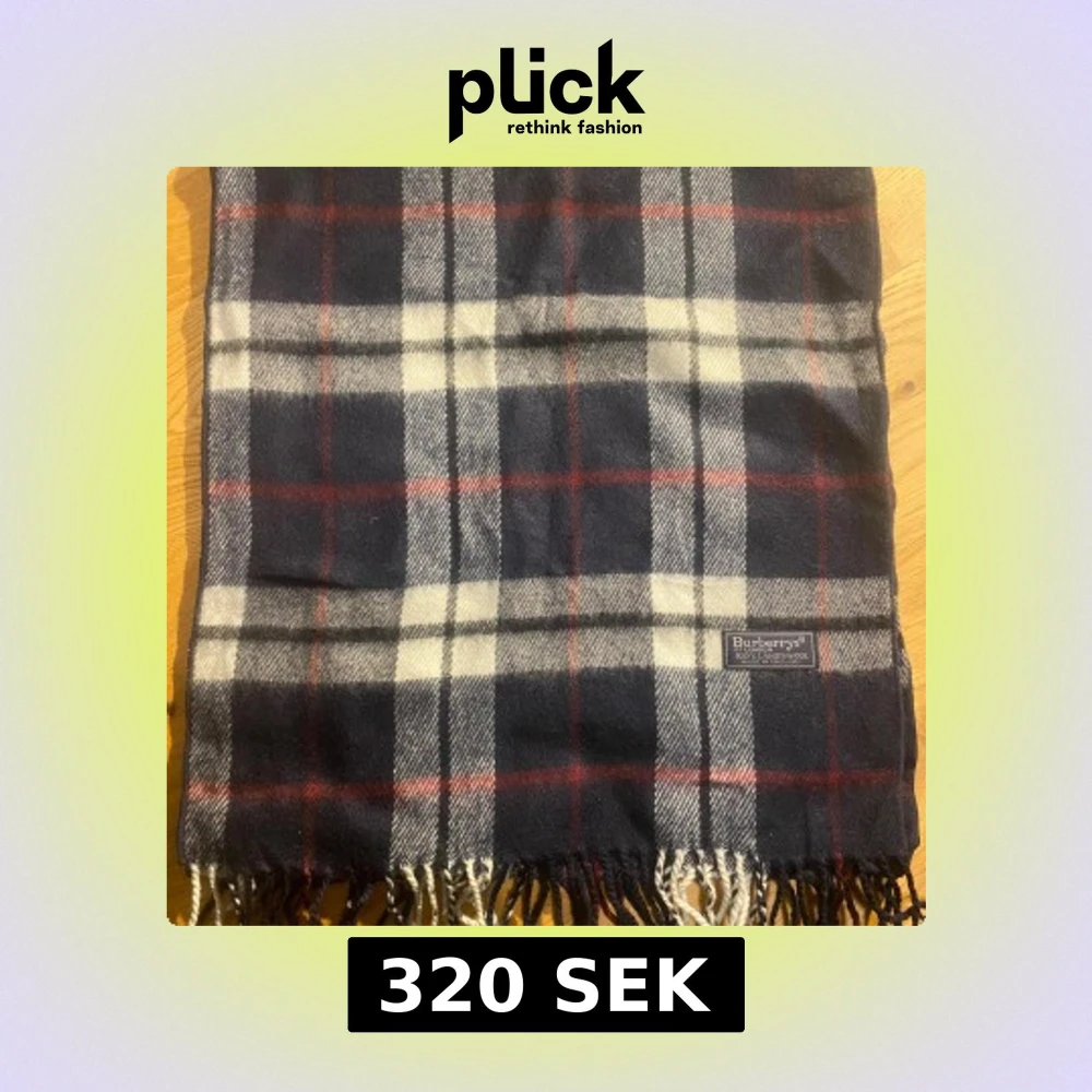 Snygg rutig halsduk från Burberrys i 100% lammull, tillverkad i England. Färgerna är mörkblå, vit och röd med klassiskt rutmönster och fransar i ändarna. Perfekt för att ge din outfit en lyxig touch och hålla dig varm under kyliga dagar.