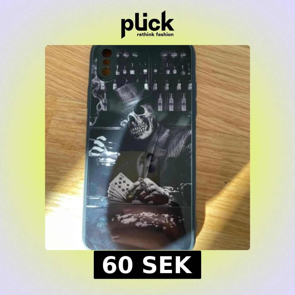 Säljer ett svart mobilskal med ett unikt tryck av en dödskalle i kostym som håller spelkort och ett glas, med bar i bakgrunden. Skalet har plats för dubbla kameror och är gjort i syntetmaterial.