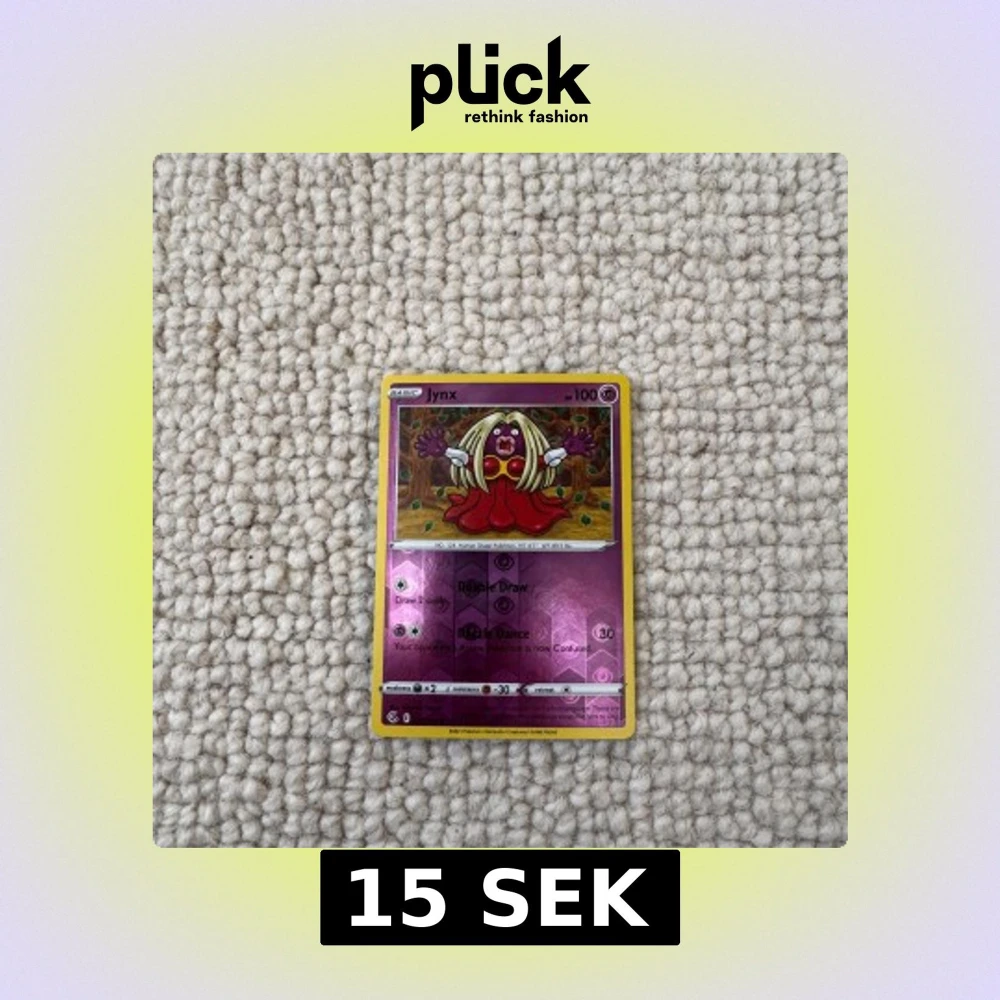 Säljer ett Pokémonkort med Jynx-motivet. Kortet är holografiskt och har lila och gula detaljer. Jynx har 100 HP och kortet har attacker som Double Draw och Attract Dance. Perfekt för samlare eller Pokémonfans!