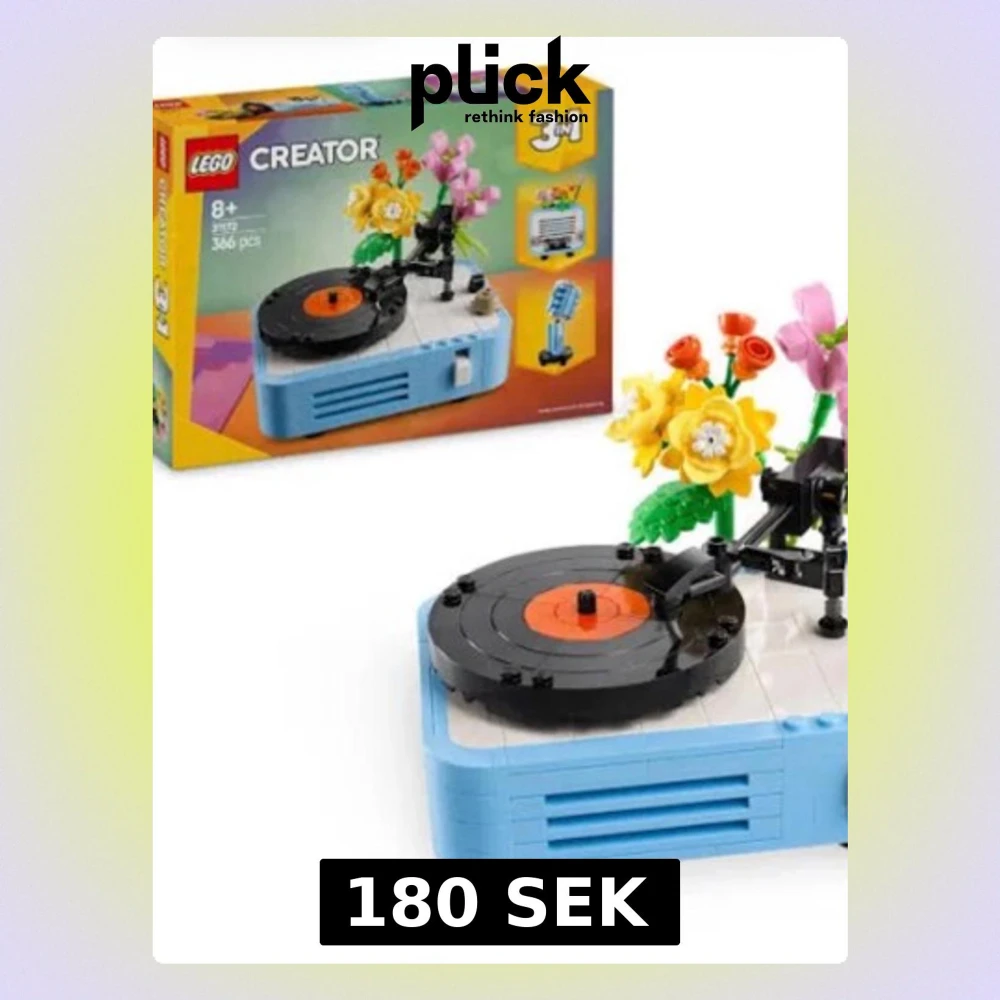 Bilden visar ingen väst utan ett LEGO Creator byggset med en skivspelare och blommor.