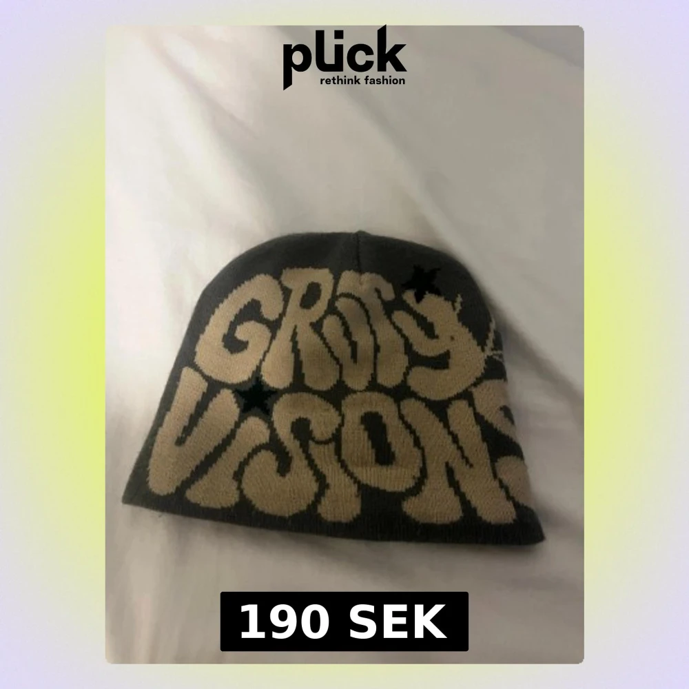 Säljer en grå mössa från Groovy Visions med beige text och coolt spindelnätsmönster på ena sidan. Mössan är stickad i mjukt material och har en avslappnad passform. Perfekt för dig som vill sticka ut lite extra. Och speciellt när det är vintern