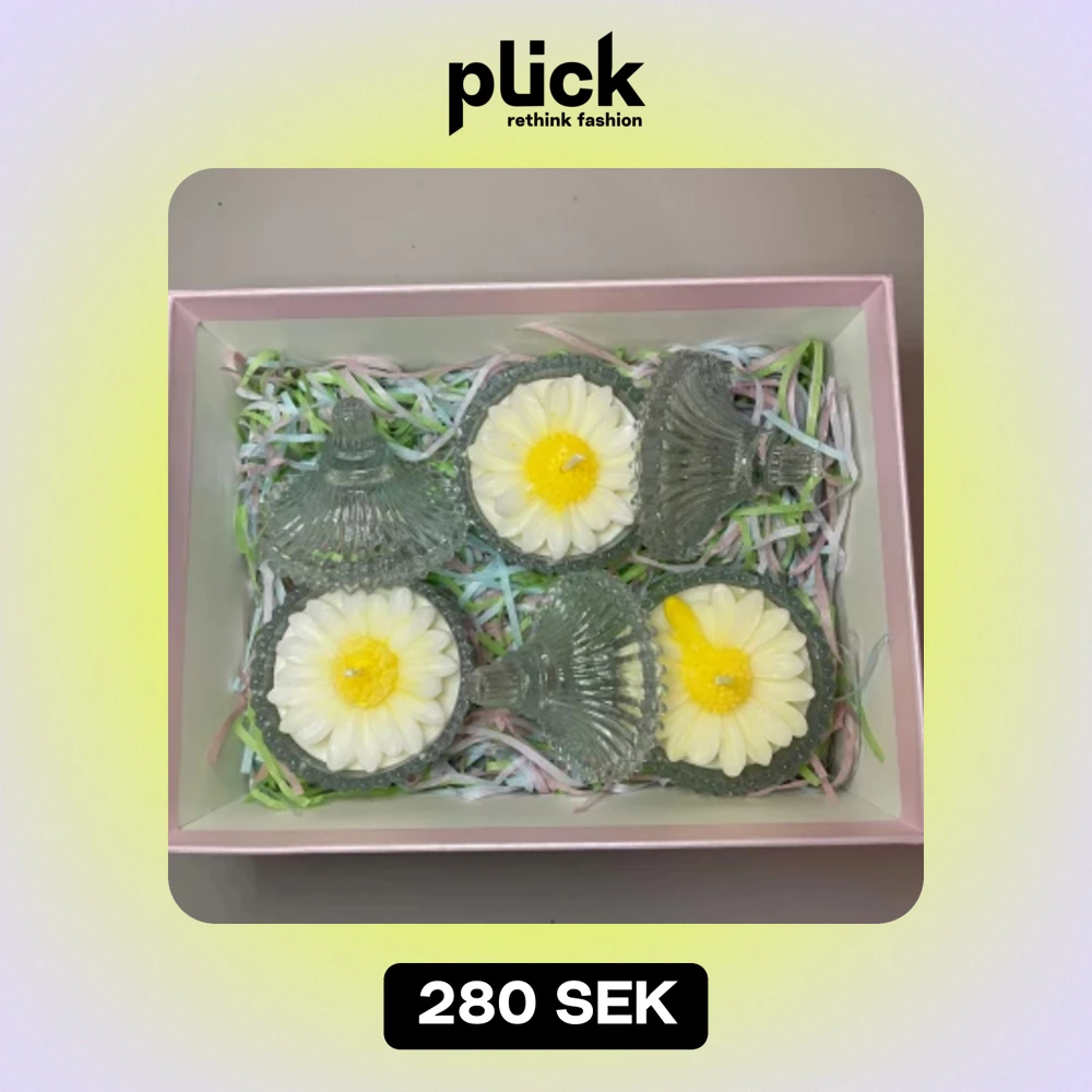 Säljer tre superfina ljus formade som blommor i glasburkar. Ljusen är vita med en gul mitt och kommer i en elegant glasburk med lock. Ljusen är gjorda av sojavax. Perfekta som dekoration eller present! 🌼vid köp kommer ljusen med paketet och slås in.