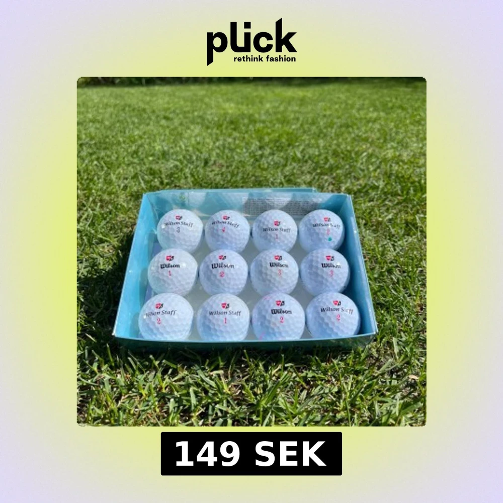 Säljer en ask med vita golfbollar från Wilson Staff. Bollarna har röd och svart text samt nummertryck. Perfekt för golfentusiasten som vill ha kvalitetsbollar till nästa runda.