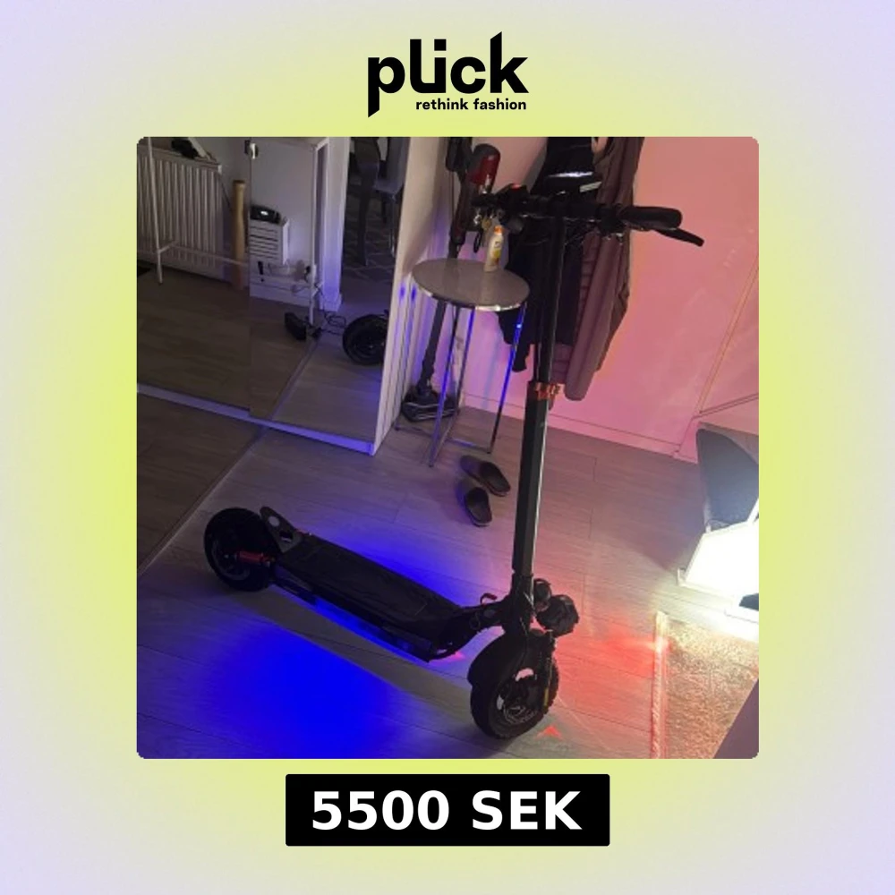 Bilderna visar en el-scooter med digital display, LED-belysning och robusta däck. Scootern har både röda och blå lampor, vilket ger en cool och futuristisk känsla. Perfekt för dig som vill ta dig fram snabbt och smidigt i stan med stil. Man får komma och möta upp mig för att köpa den. Har kvitto på den. Den åker 50km.
