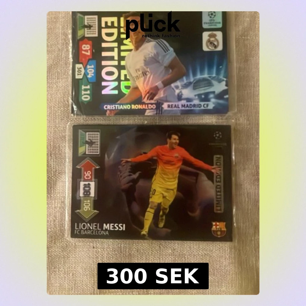 Säljer två Panini limited edition kort med Messi och Ronaldo. Båda korten är i bra skicka och kommer med plastfickor.