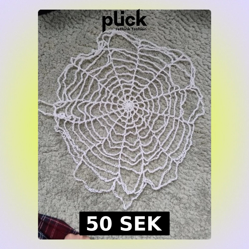 Handgjord virkad duk med spindelnätsmönster. Virkad med bomullsgarn, den tål alltså värme i viss grad, även om man ska vara försiktig.
