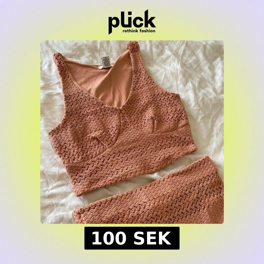 Supersöt sett i stickad stil med brun färg. Överdelen har breda axelband och v-ringning, och båda delarna är virkade med ett luftigt mönster. Perfekt för stranden eller poolen om du vill sticka ut med en unik look.