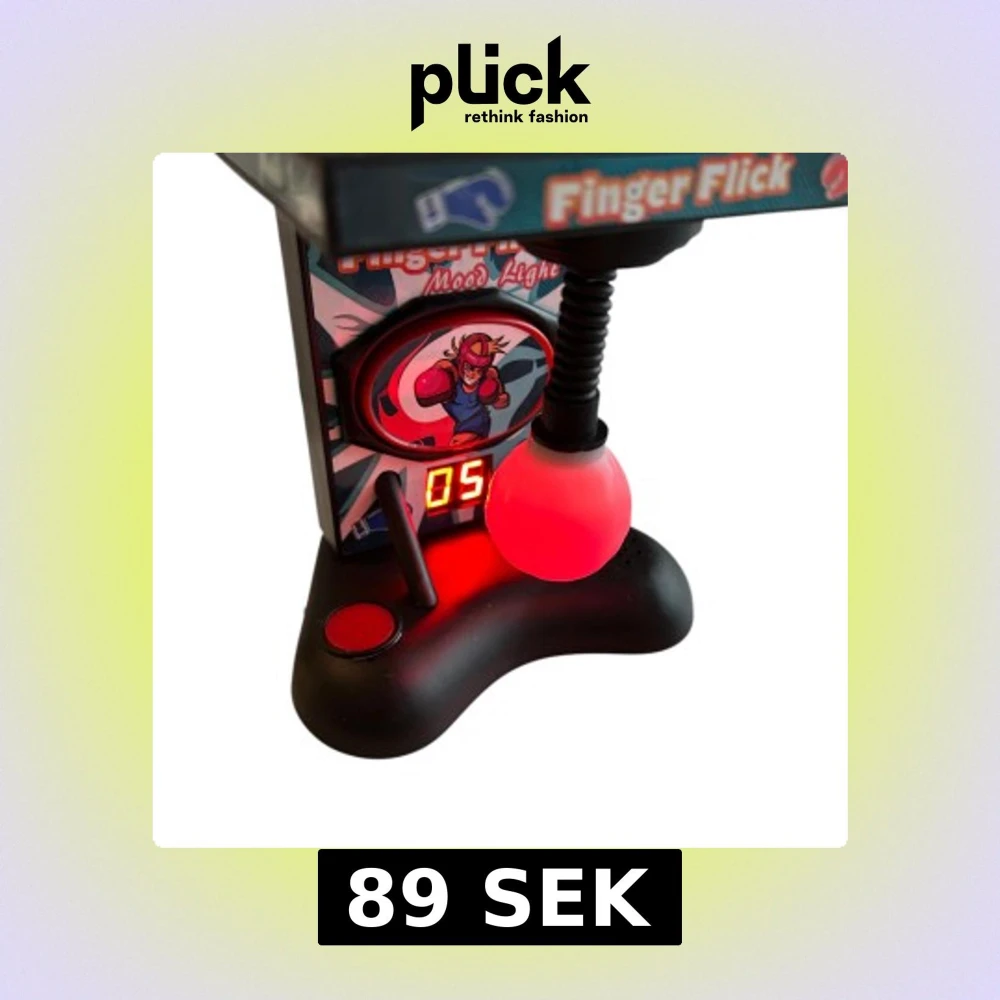 Säljer ett mini boxningsspel med LED-lampa som skiftar färg. Spelet har en digital poängräknare, svart bas och en boxningsboll i plast. Perfekt som rolig prydnad eller stressleksak till skrivbordet. Märkt med 'Finger Flick' och har en tecknad boxare på framsidan.