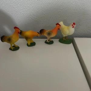 Fyra små hönsfigurer i plast, i olika färger som gul, orange och vit. Perfekta för dekoration eller som leksaker. Varje figur står på en grön bas.