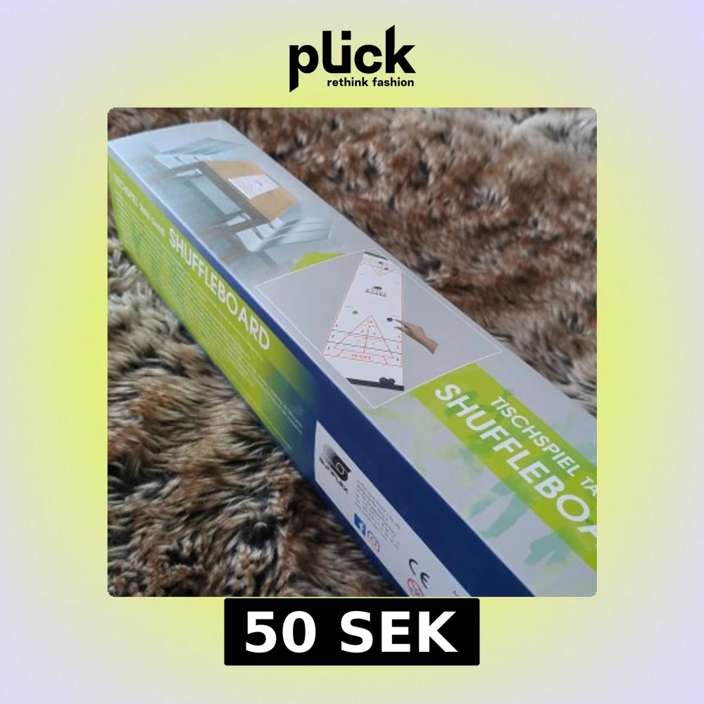 Säljer ett shuffleboard spelset som är perfekt för bordsspel hemma. Setet innehåller en spelmatta och spelpjäser i gult och svart. Lätt att rulla ihop och förvara i den medföljande lådan. Perfekt för roliga spelkvällar med vänner och familj!