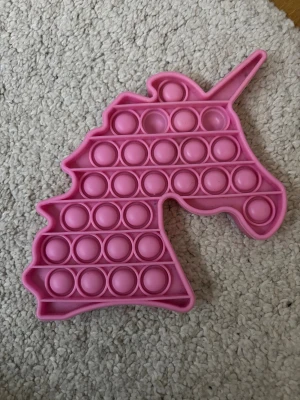 Rosa Pop It fidget-leksak i form av en enhörning. Tillverkad i mjuk silikon, perfekt för stresslindring och sensorisk lek. Produkten är i gott skick med endast mindre tecken på användning. Rolig och tålig för både barn och vuxna.