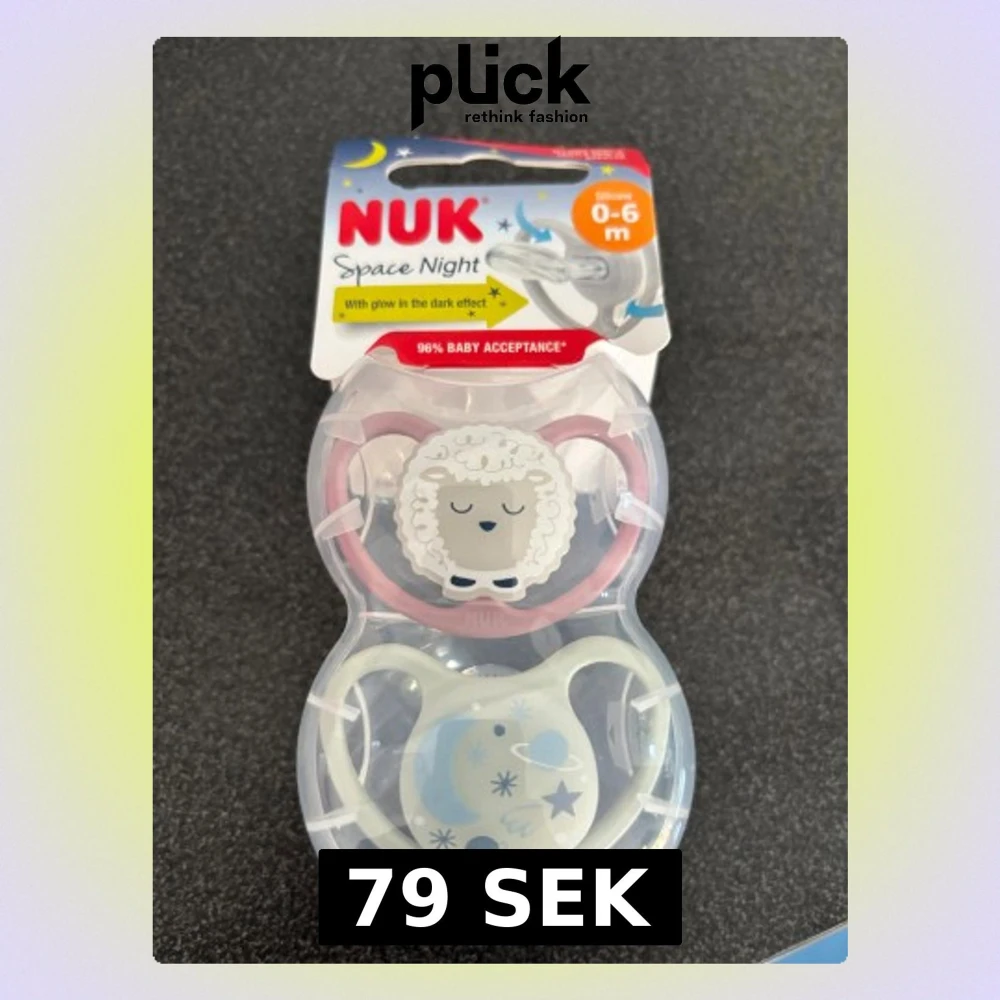 NUK Space Night napp för 0-6 månader, med glow in the dark-effekt. Säljs i originalförpackning, helt ny och oanvänd. BPA-fri silikon, tillverkad i Tyskland. Söt design med får och rymdmotiv, perfekt för natten. Helt nyköpt men köpte för många!