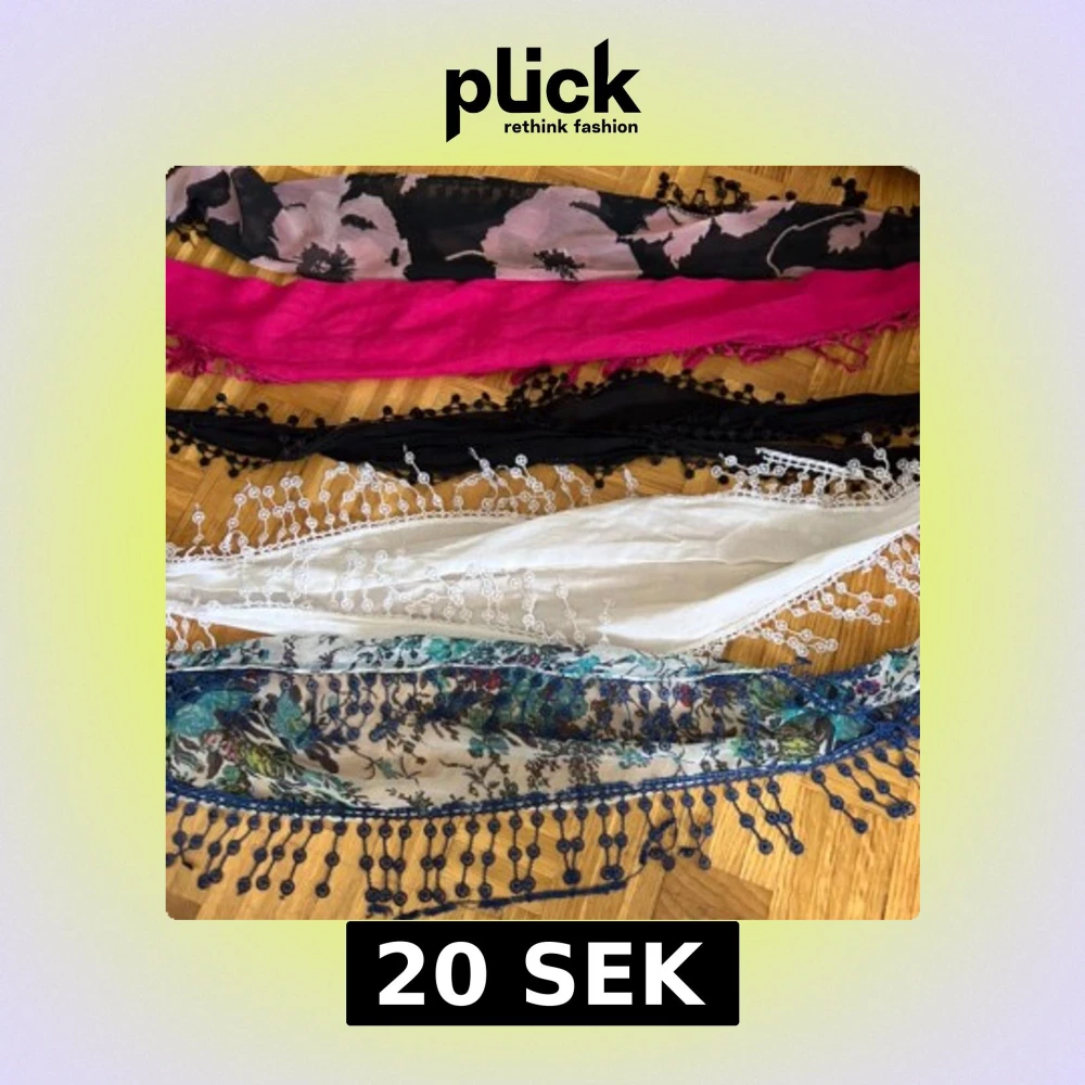 Fem smala och lätta halsdukar i olika färger och mönster. En svart med stora blommor, en knallrosa, en helsvart, en vit med spetskant och en transparent med blå blommor och blå spets. Perfekta att styla till olika outfits för en unik look.