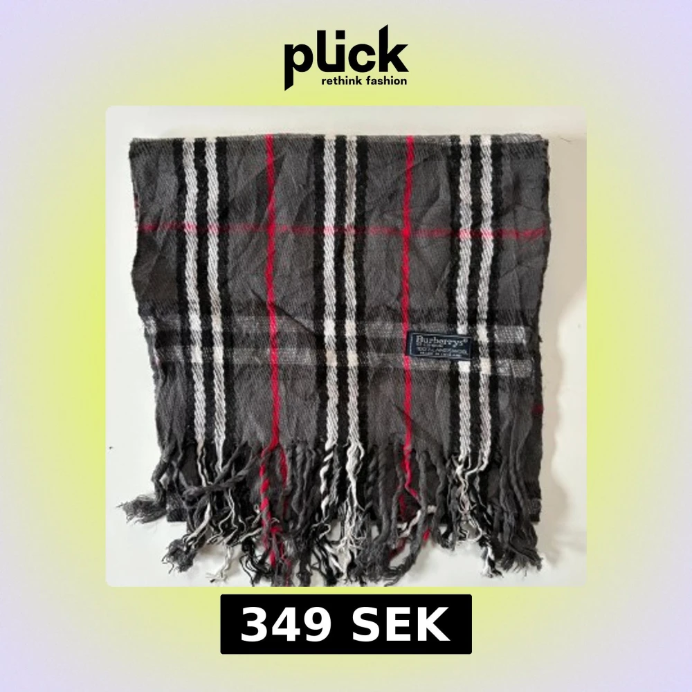 Snygg rutig halsduk från Burberrys i 100% lammull, tillverkad i England. Färgerna är grå, svart, vit och röd med klassiskt rutmönster och fransar i ändarna.