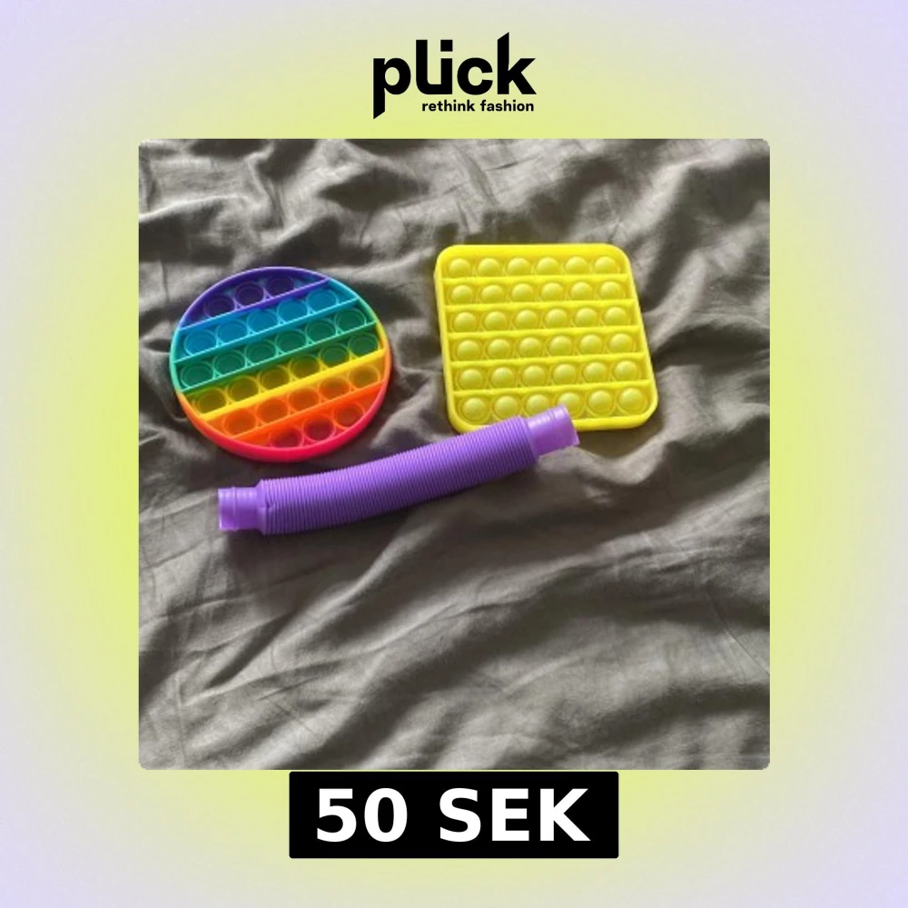 Bilden visar två pop it-leksaker och ett flexibelt rör