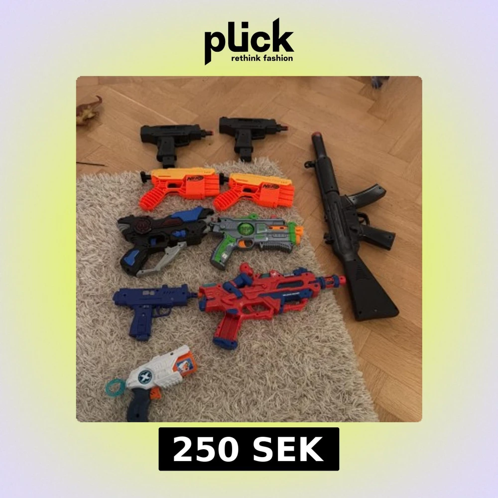 Paket med 8 olika leksakspistoler och ett gevär i plast. Flera färger och modeller, vissa med futuristisk design. Synligt använda men i gott skick, inga större skador. Perfekt för lek och rollspel.