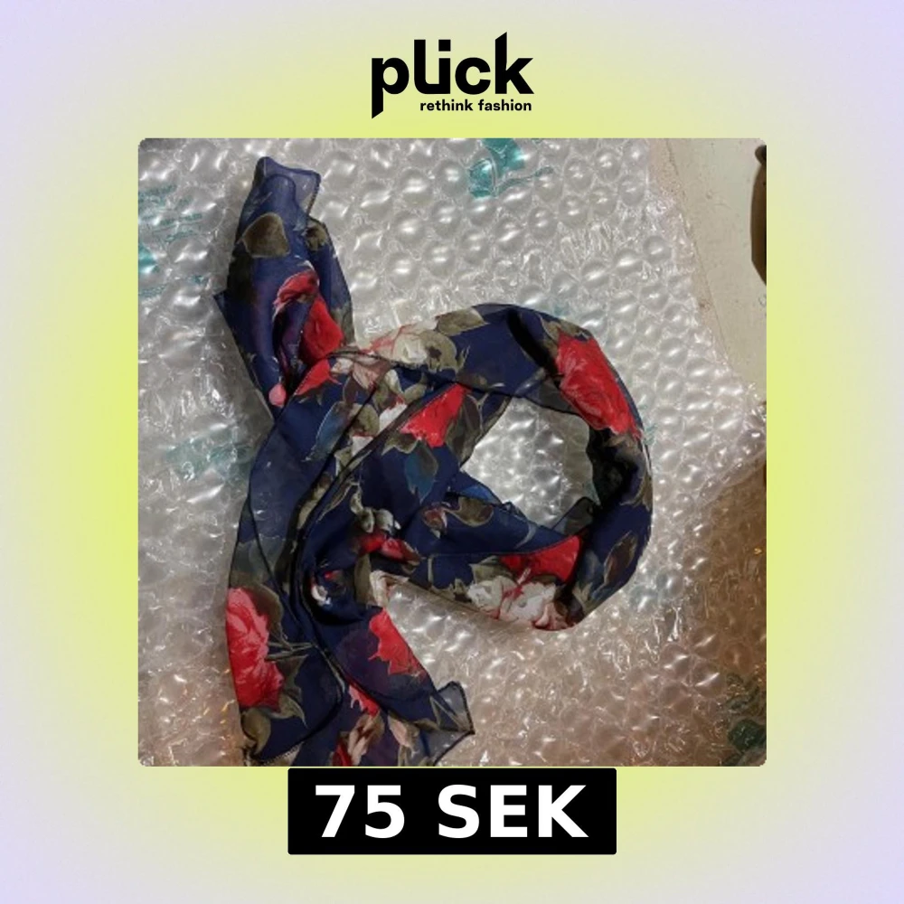 Snygg och tunn halsduk med blommigt mönster i rött, vitt och grönt på en mörkblå botten. Perfekt accessoar för att lyfta din outfit med lite färg och stil. Lätt och luftig, passar bra att knyta runt halsen eller i håret.