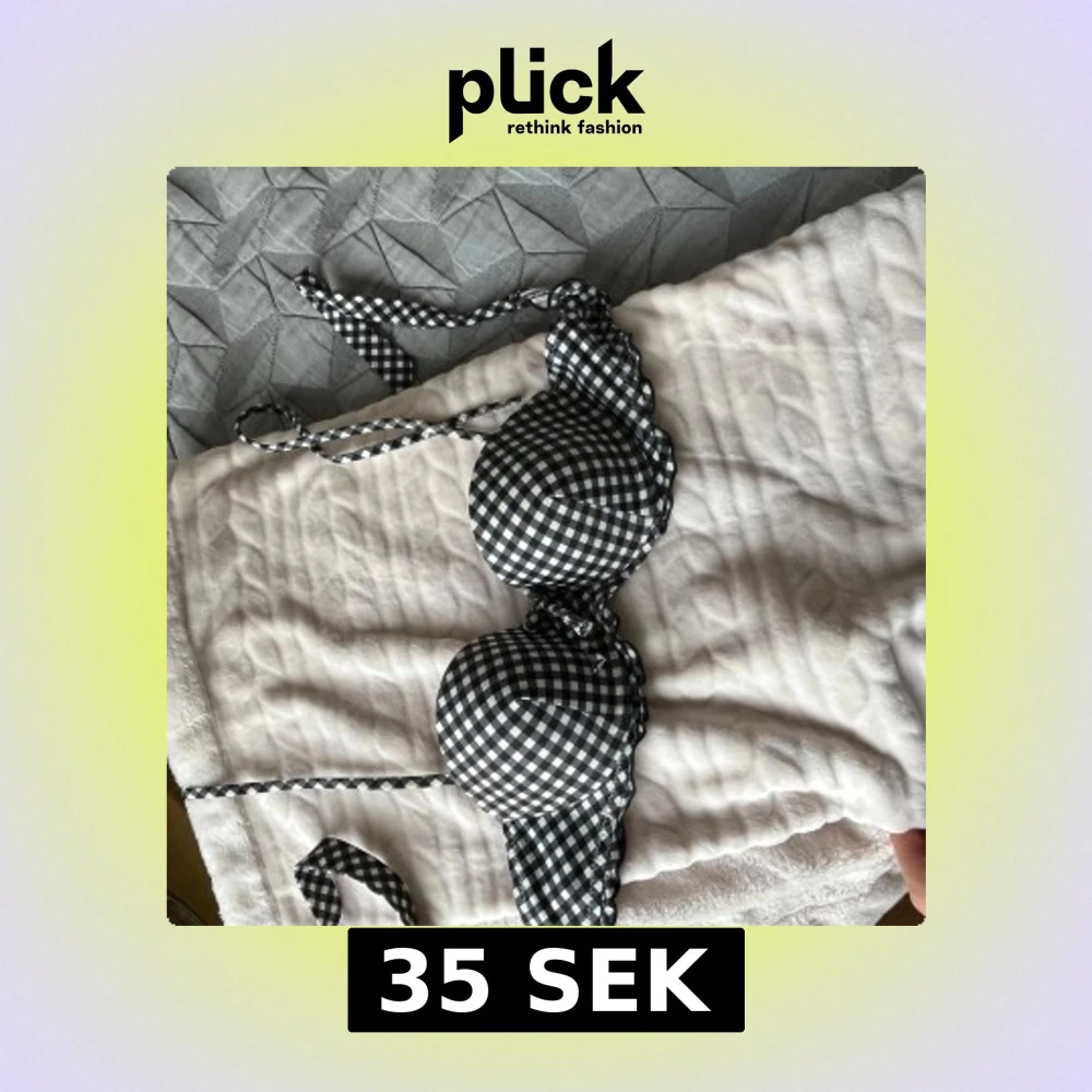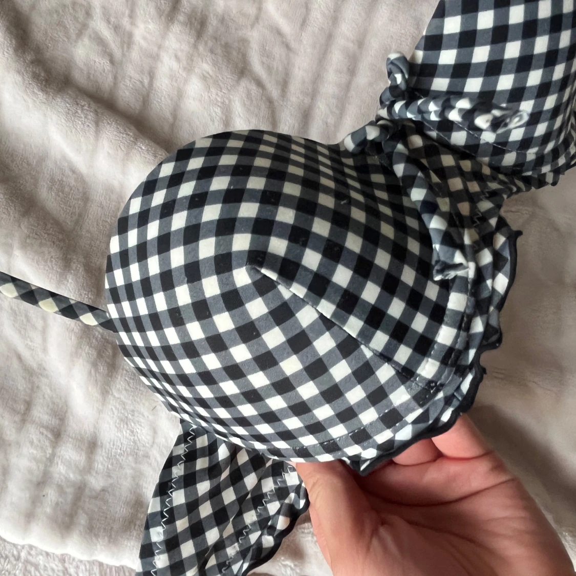 Supersöt bikiniöverdel i svartvitt rutigt mönster med volangdetaljer längs kanterna. Bikinin har vadderade kupor och knytband både i nacken och runt ryggen. Perfekt för sommaren och strandhäng!
